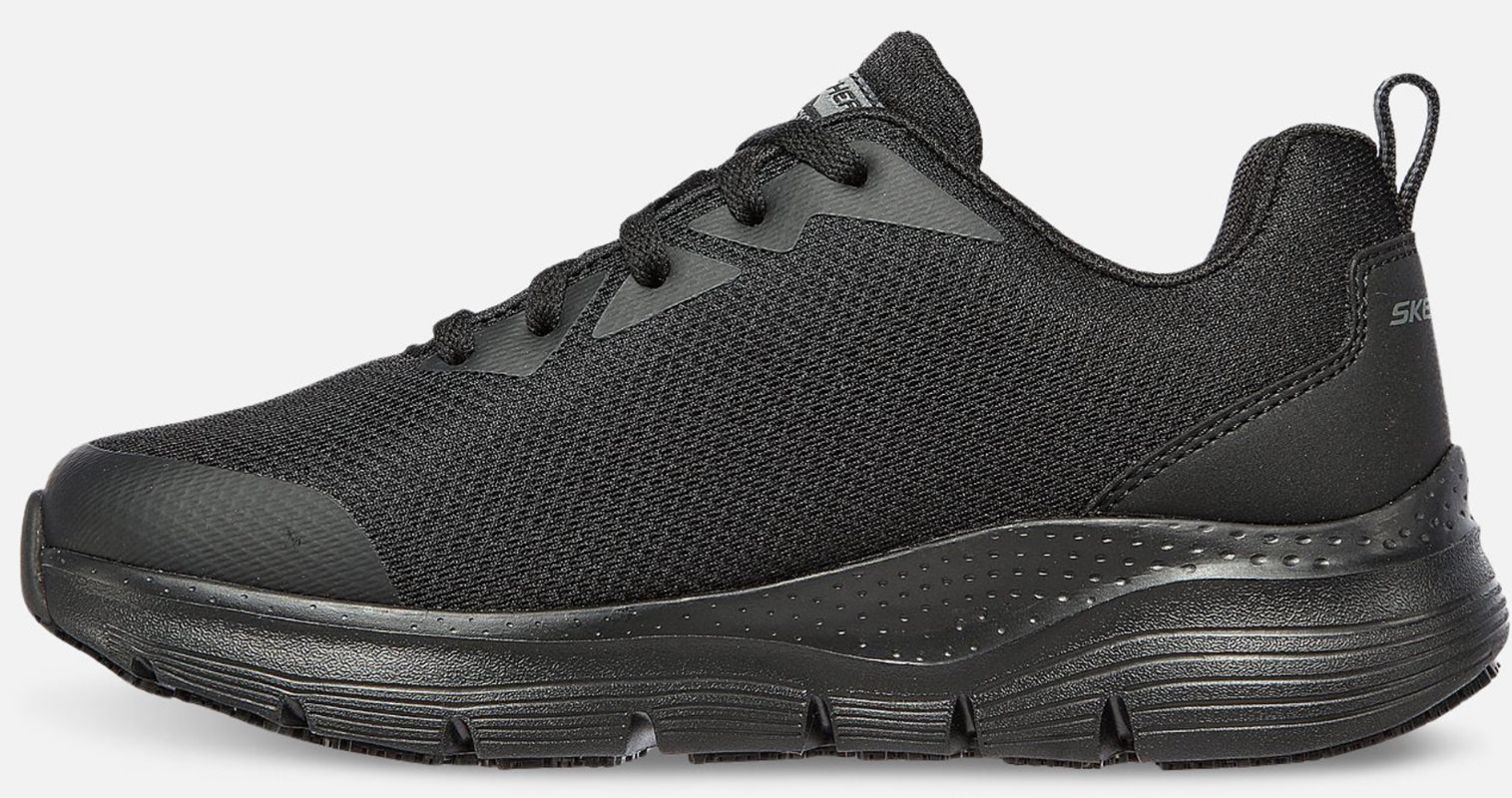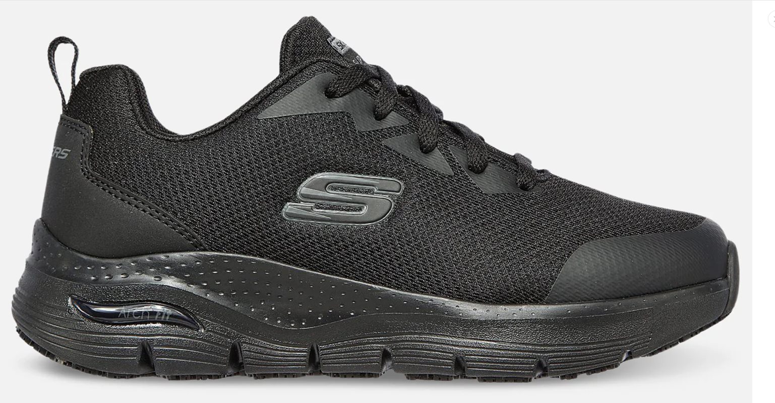 Skechers Arch Fit SR är en halkfri arbetssko, som är antistatisk upp till 1000 kiloOhm. I denna arbetssko finns det extra stöd under fotvalvet. Extra stöd under fotvalvet fördelar kroppens vikt över hela foten och foten belastas därmed mindre. Ovandelen är tillverkad av mesh, vilket gör att foten kan andas och skapar ett hälsosamt inomhusklimat för foten. Vid häl och tåhätta finns ett lager med extra vaddering. Detta ökar skornas slitstyrka samtidigt som det bidrar till att ge komfort och stabilitet för foten. Yttersulan är halktestad och godkänd enligt högsta möjliga standard